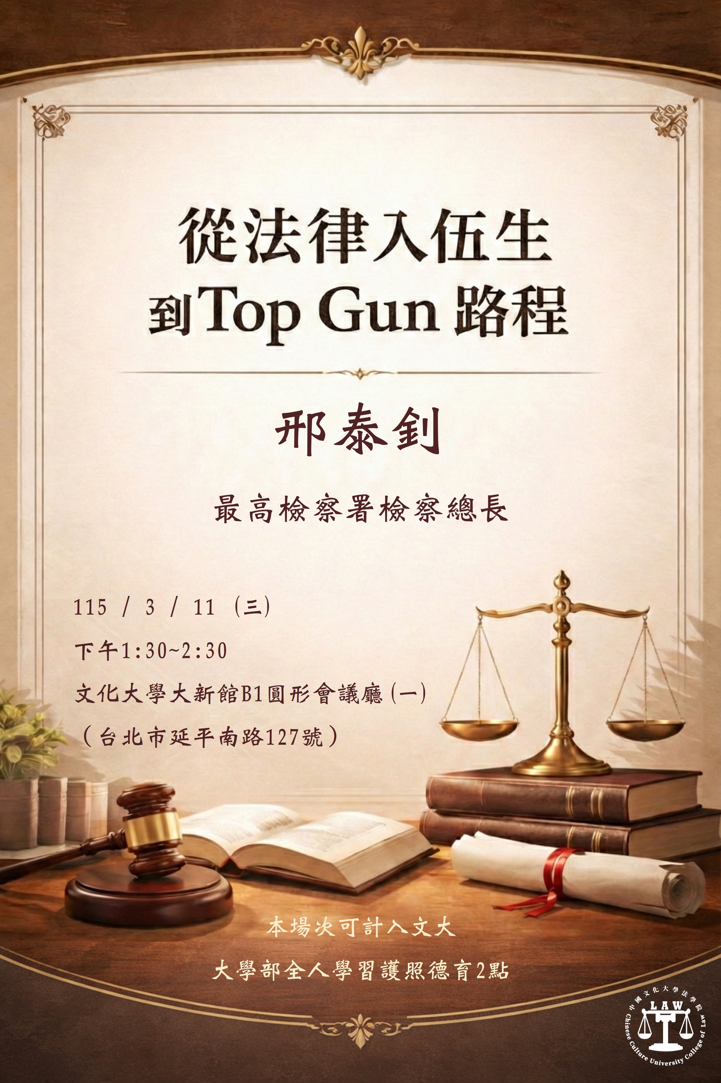 本院訂於 115年3月11日(星期三)下午1時30分至2時30分,舉辦實務講座,特別邀請 最高檢察署檢察總長 邢泰釗 蒞臨分享其從法律人到實務菁英之歷程,誠摯邀請全校師生踴躍參加。